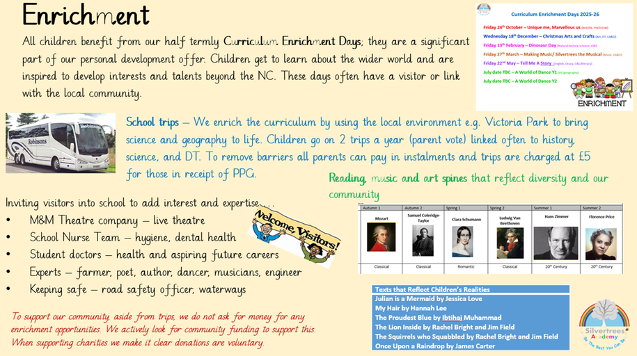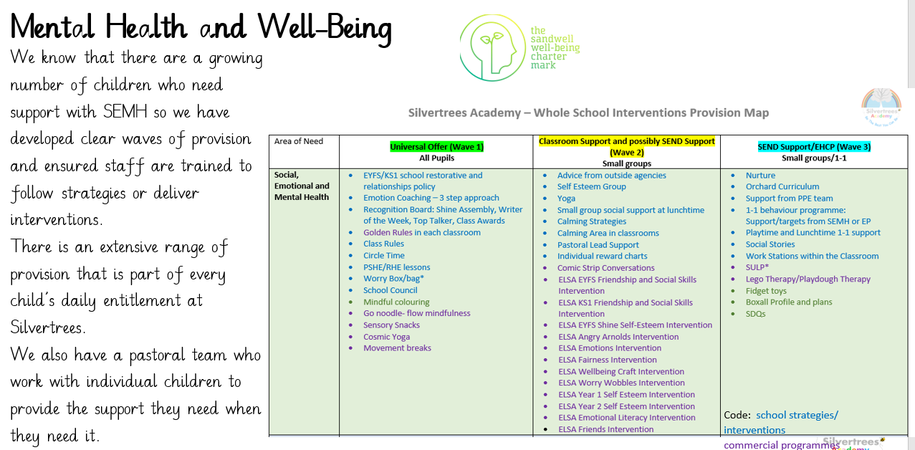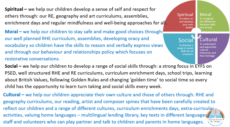 INTENT: Every leader and staff member at Silvertrees Academy is dedicated to shaping young lives now so they can build bright and fulfilling futures. We want every child at Silvertrees to develop a strong sense of identity and self-worth that will give them the confidence and resilience to succeed in an ever changing and demanding world. We will give children the knowledge and skills to be happy and healthy; to keep themselves safe and be physically and mentally healthy. They will develop the skills to form healthy relationships in our modern world. Our children will know how to make the right choices but will also be aware of their rights and have the confidence to say no! As an infant school we want our children to see the awe and wonder of the world around them; to be excited, to explore and be part of a wider community. To understand the richness of our diverse community and embrace and celebrate differences. In short, at Silvertrees we are committed to shaping resilient and responsible young people who have positive lives and a positive effect on the lives of others.
